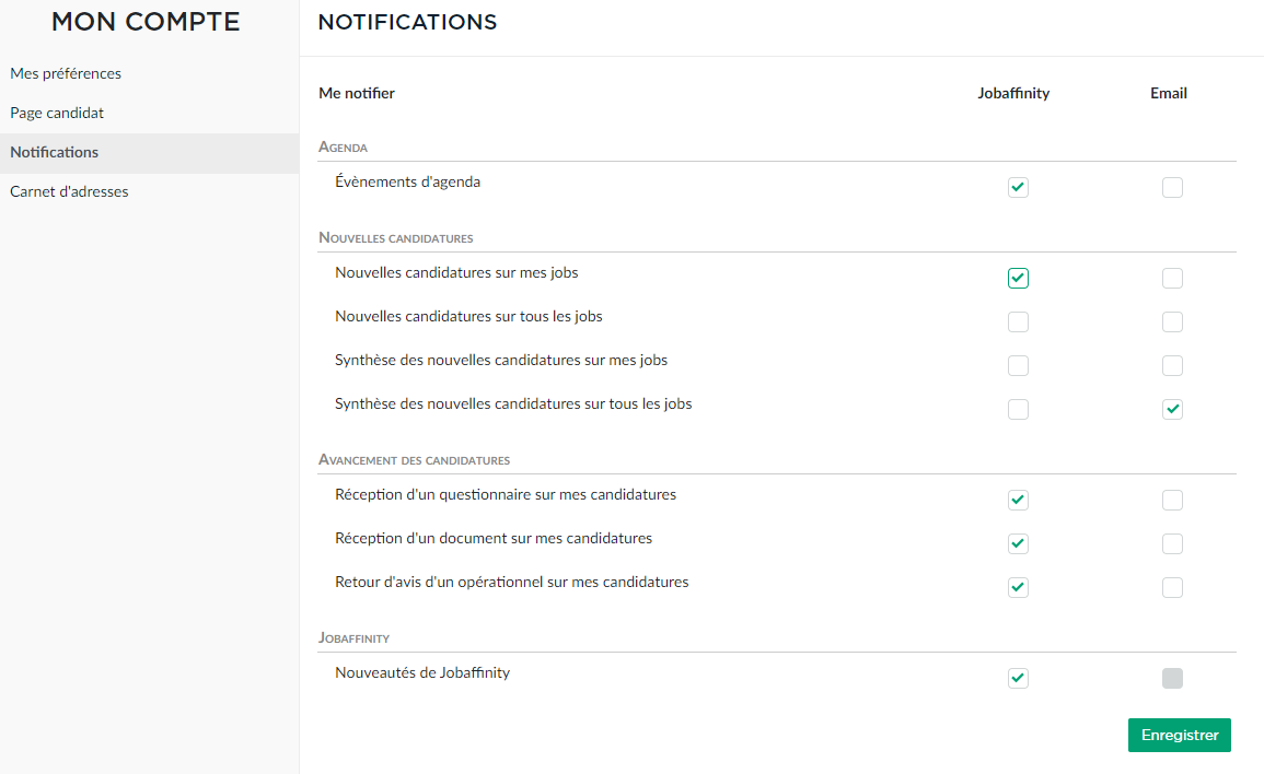 Vous pouvez choisir d'être notifié directement dans Jobaffinity ou par mail