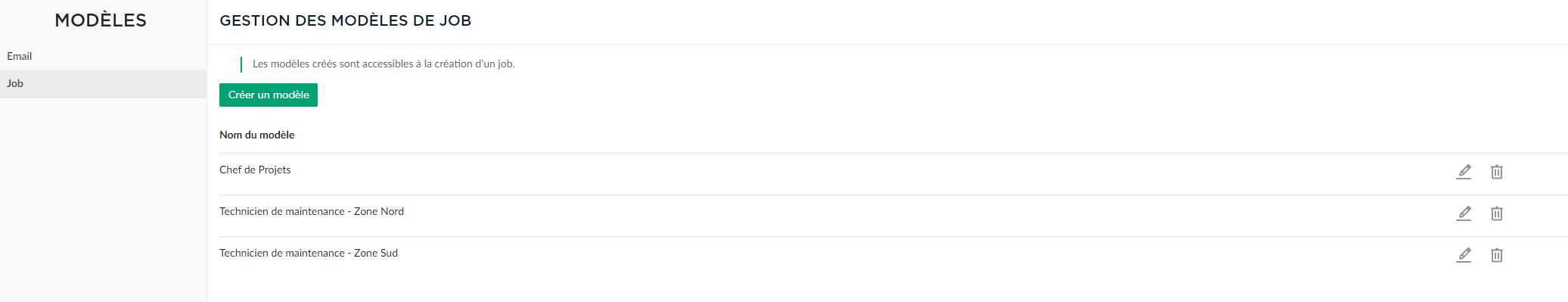 - Modèles de Job : permet de gérer et créer des modèles de postes