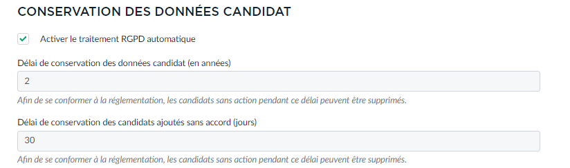 Il faut indiquer le délais et activer la case en dessous pour la suppression automatique. Ainsi, conformément à la législation, les candidats sans interaction pendant ce délai seront supprimés.