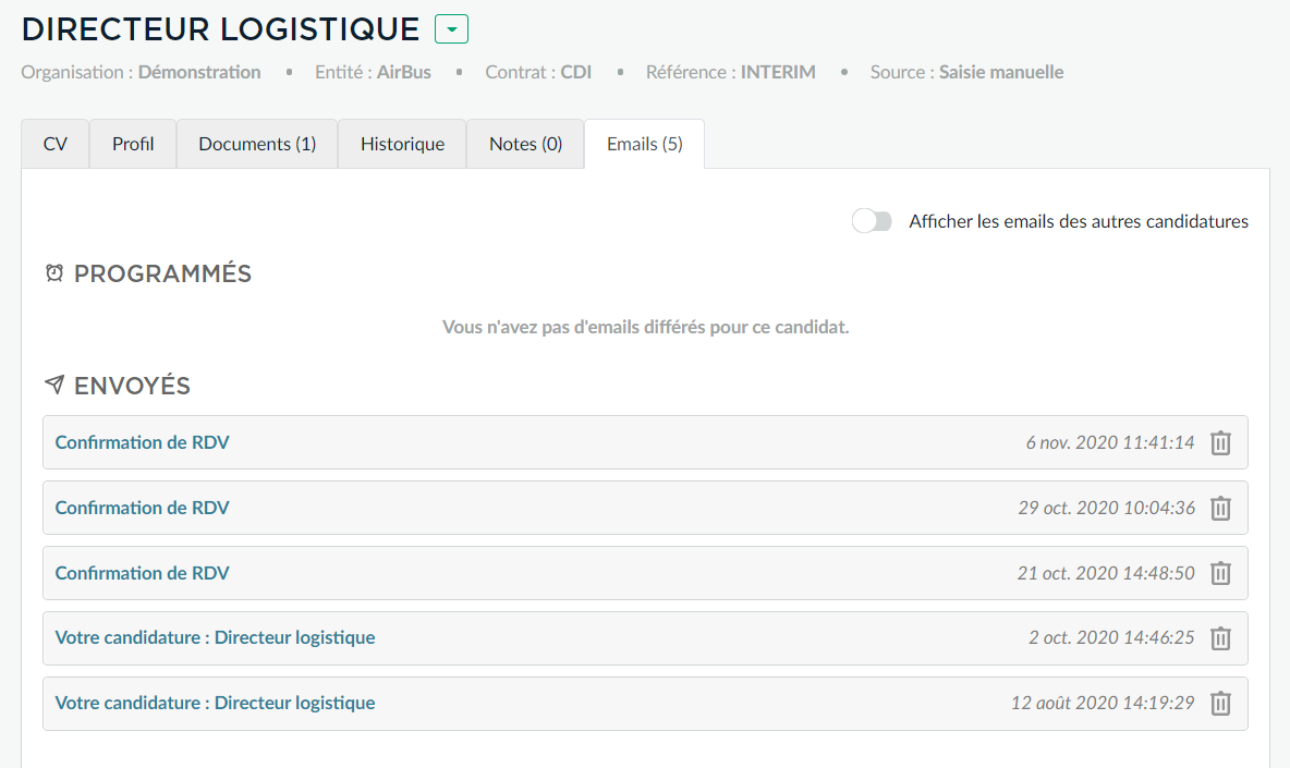 A tout moment il vous est possible de choisir d'afficher les e-mail des autres candidatures de ce candidat