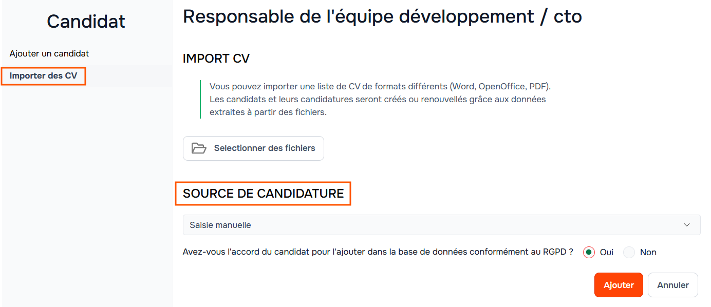 Importer en masse des CVs depuis mon Job Importer ma sélection de CVs dans mon JOB Cliquez sur le JOB Cliquez sur "+" Sélectionnez les CVs et ajoutez. Sélectionnez dans la liste déroulante la source de candidature afin d'indiquer leur provenance.