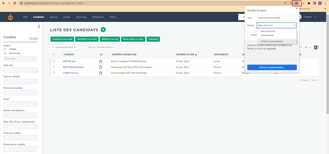 2. Cliquer sur l'étoile en haut à droite de votre barre de favoris afin d'enregistrer votre recherche. Sélectionner dans "Dossier" l'option "Choisir un autre dossier" afin de créer un dossier dans lequel vous rassemblerait l'ensemble de vos favoris.
