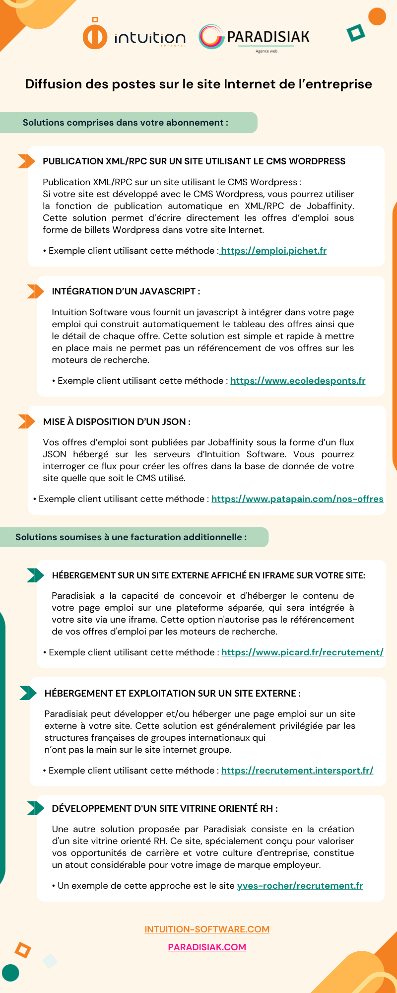 Vous pouvez facilement diffuser les annonces depuis le logiciel Jobaffinity vers votre site web. Pour cela nous vous proposons 5 solutions à choisir dans ce guide
