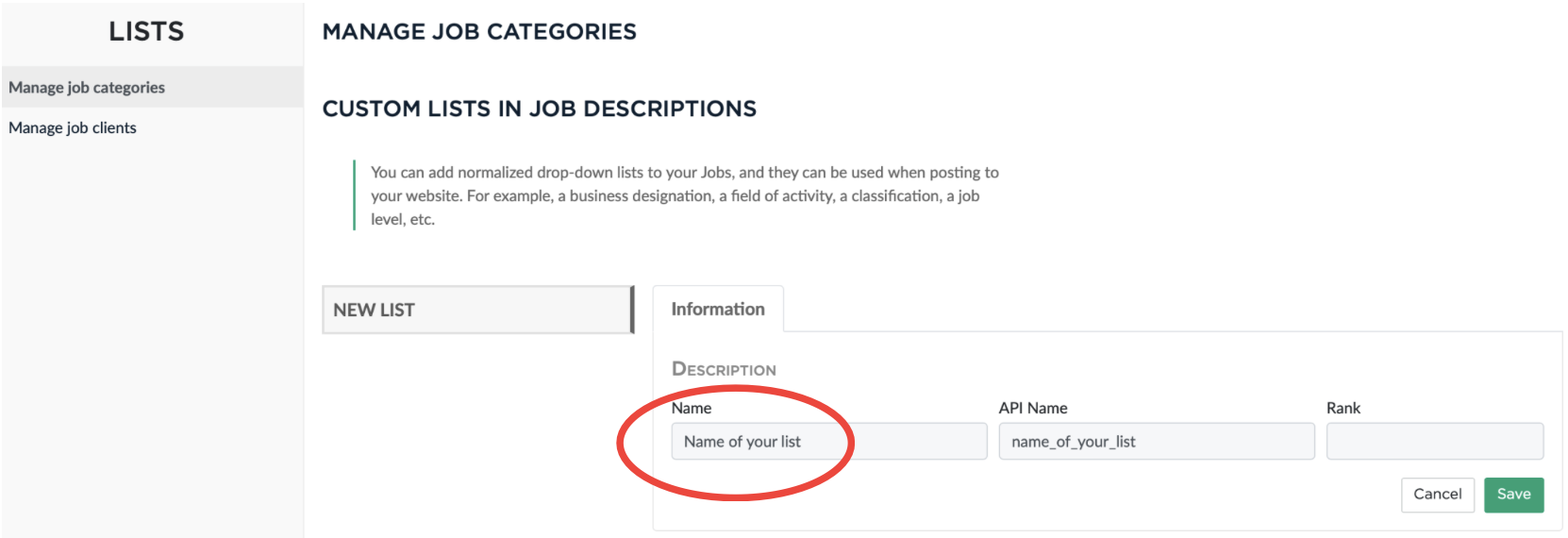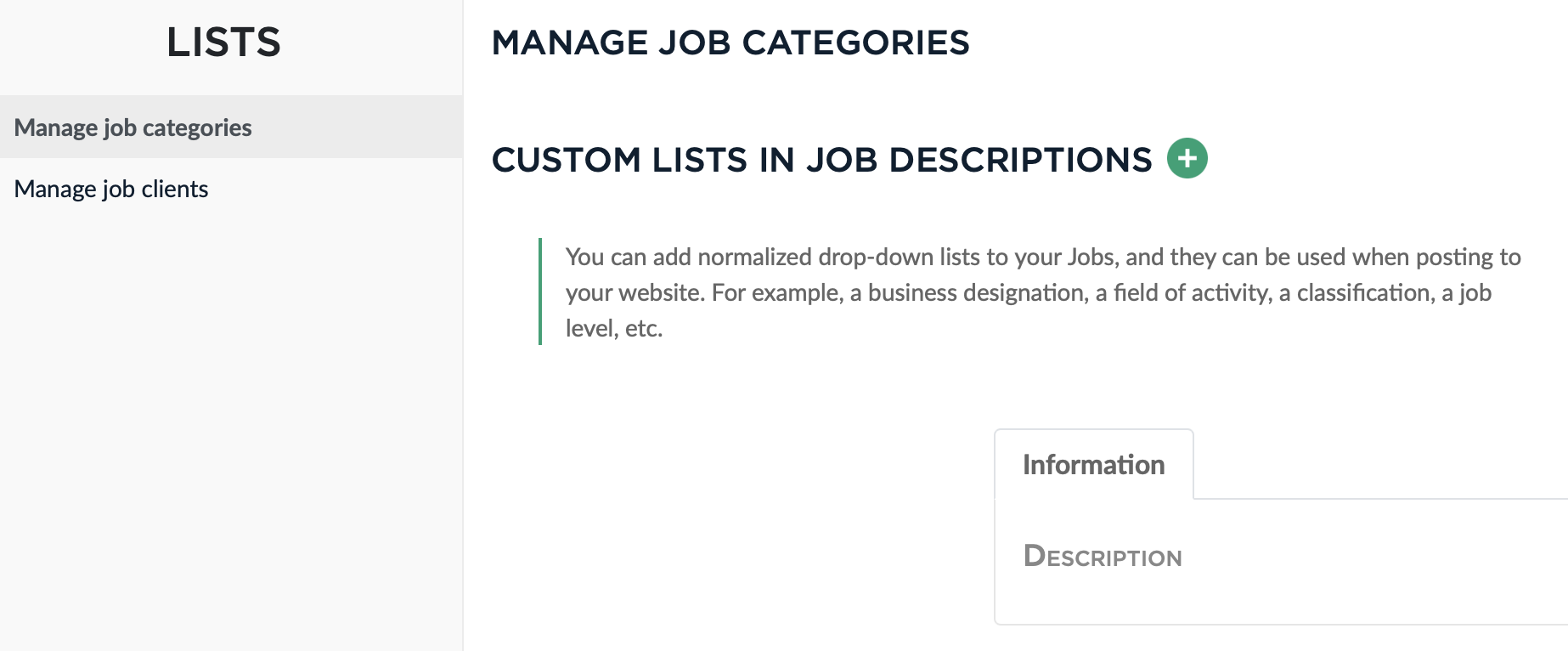 You can add standardised drop-down lists to your Jobs that can be used when posting them on your website. For example a job type, a classification, a job level .