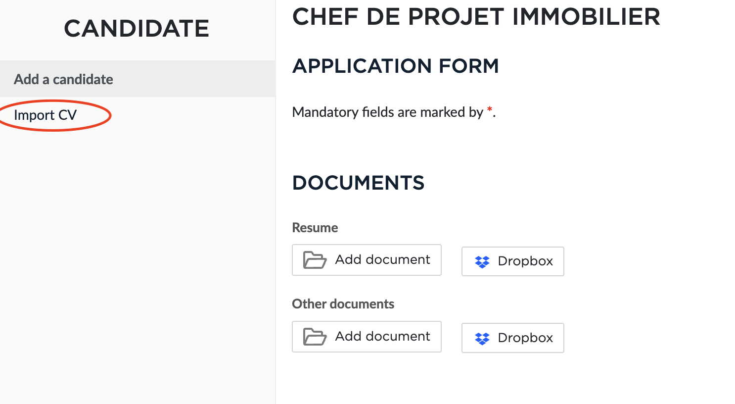 Import a CVs in a Job Import a selection of CVs into a JOB Click on the JOB Click on the green + sign Select the CVs and add