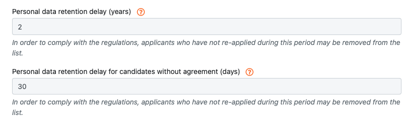 - Set the retention period for manually entered applicants for whom you do not yet have GDPR approval, for each of your organisations, in the ADMIN/Rgpd menu.