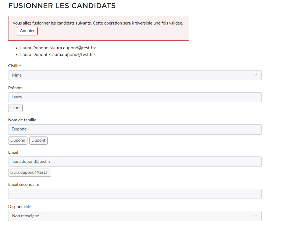 Attention : Pour cela, le droit « Fusionner les candidats » doit être activé par un administrateur dans la page Admin/Utilisateurs pour l'utilisateur concerné.