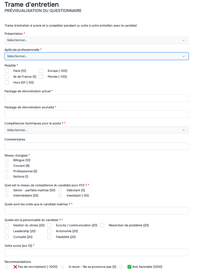 Voici un exemple de questionnaire d'évaluation pendant un entretien :
