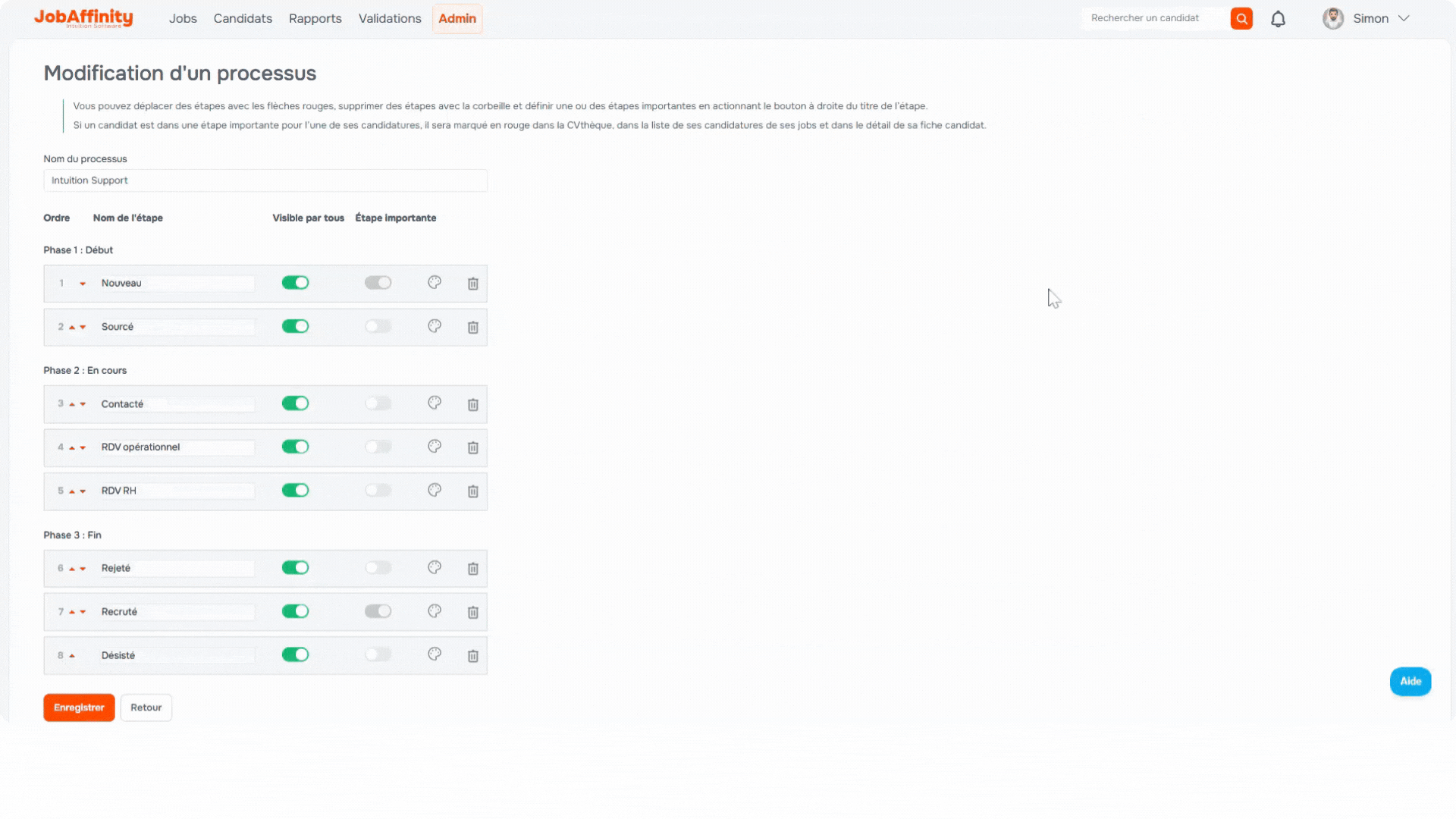 - 🎨 Étapes colorées : donnez du rythme à votre processus en personnalisant vos étapes avec des couleurs directement depuis le menu Admin > Processus.