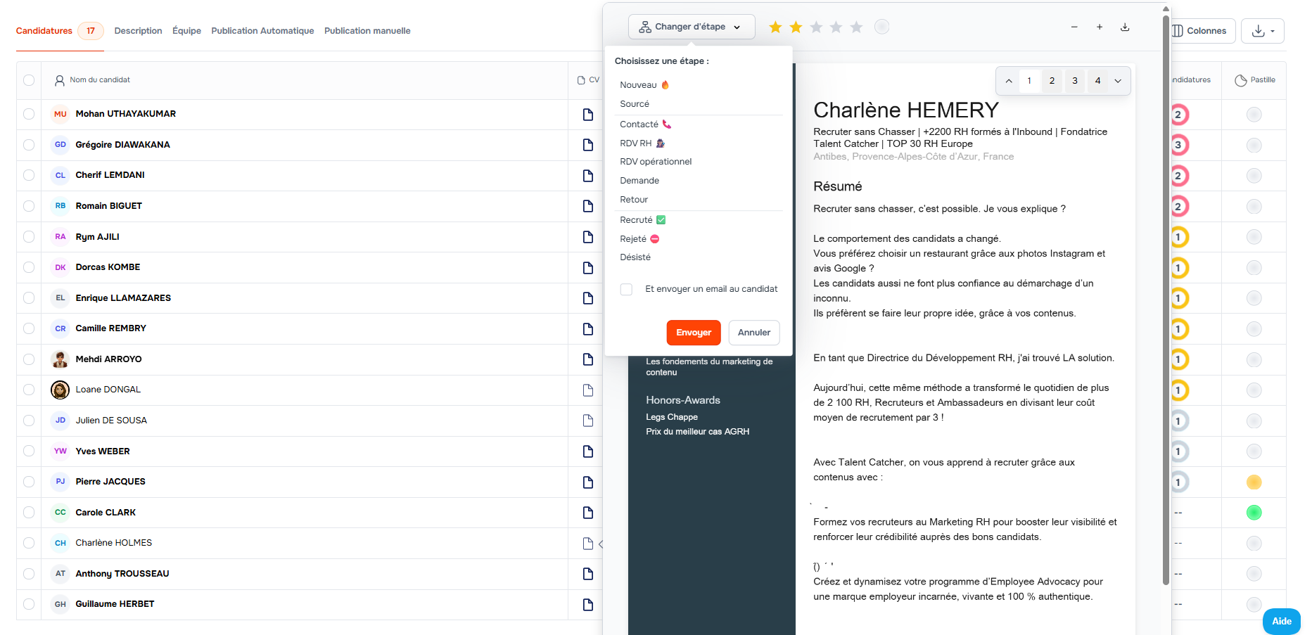 - 🎯Actions clés sur la pré-visualisation des CV : changer d'étape, noter les candidats, ajouter une pastille directement depuis le survol du CV.