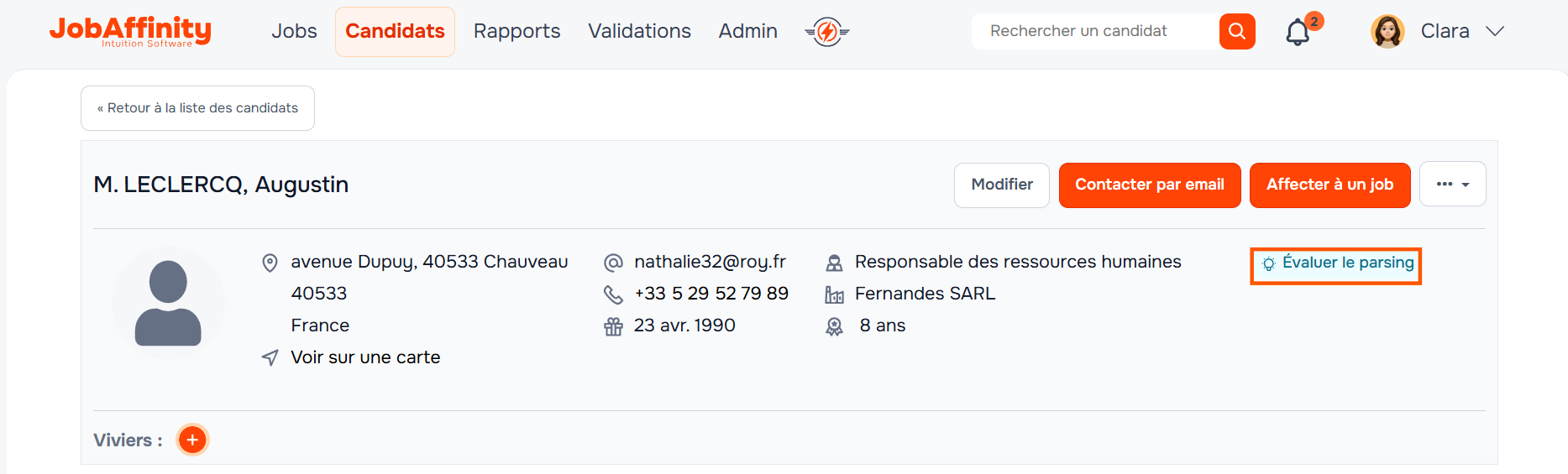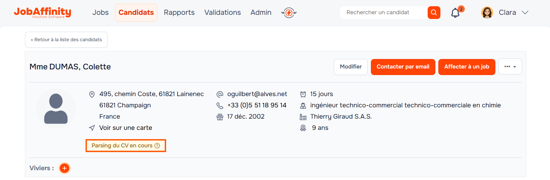 Le badge parsing que vous voyez directement sur la fiche du candidat vous permet de visualiser instantanément si le parsing du CV (extraction automatique des données) est en cours ou déjà finalisé.