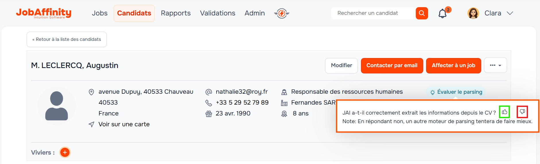 - En cliquant sur le pouce rouge, vous signalez une mauvaise extraction, le moteur relance alors automatiquement l’analyse du CV.