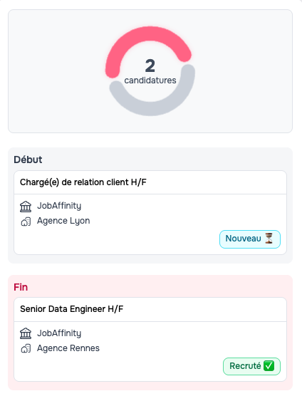 💡 Idéal pour les groupes multi-entités : identifiez d’un coup d’œil si un candidat a déjà postulé ailleurs, sans ouvrir chaque fiche.