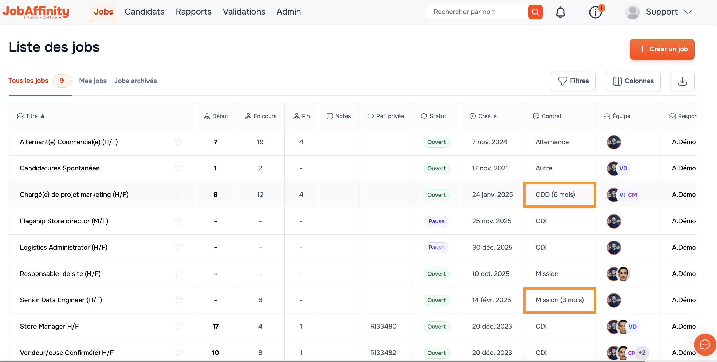 La durée des contrats (CDD, intérim, stage) s’affiche désormais directement dans la colonne “Contrat”.