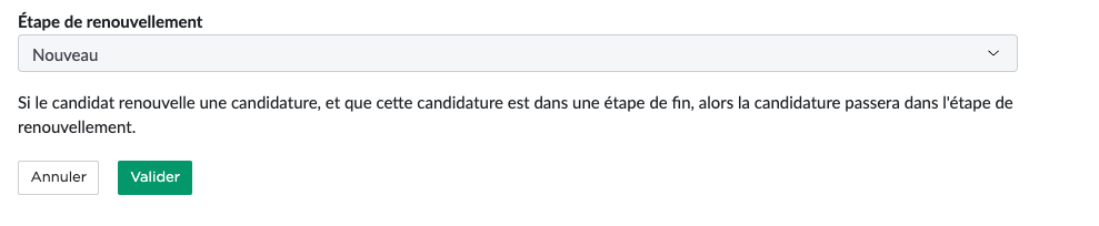 Si le candidat renouvelle une candidature, et que cette candidature est dans une étape de fin, alors la candidature passera dans l'étape de renouvellement.